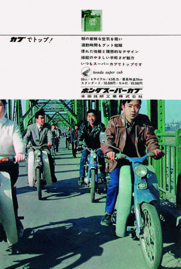 朝の新鮮な空気を吸い 通勤時間もグット短縮 優れた性能と理想的なデザイン 操縦のやさしい手軽さが魅力 いつもスーパーカブでトップです ……ちなみに上の方にある小さな写真は、タイムカードを押している写真です