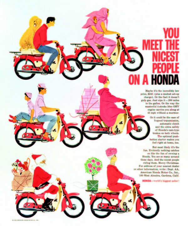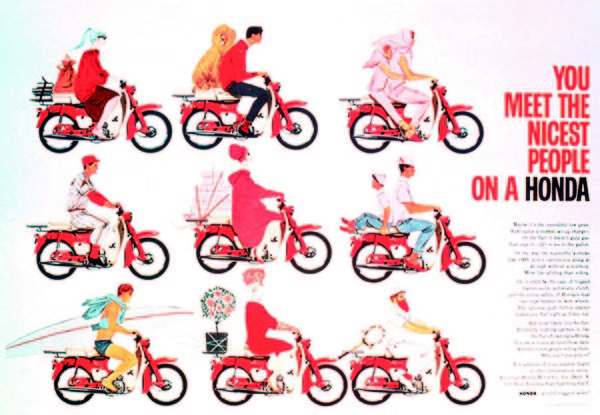 オシャレで爽やかな人たちが笑顔でカブに乗るイラストや写真。直訳すると「良い人たちがホンダに乗る」という意味で、この広告でカブは一気に良いイメージで拡散されたんだそうです。約55年ほど前のものとは思えないモダンで粋なデザインです。