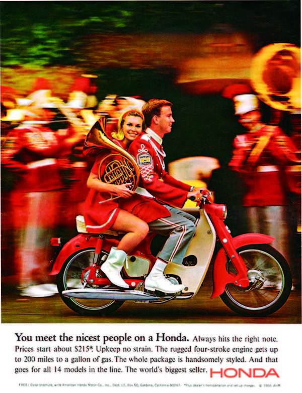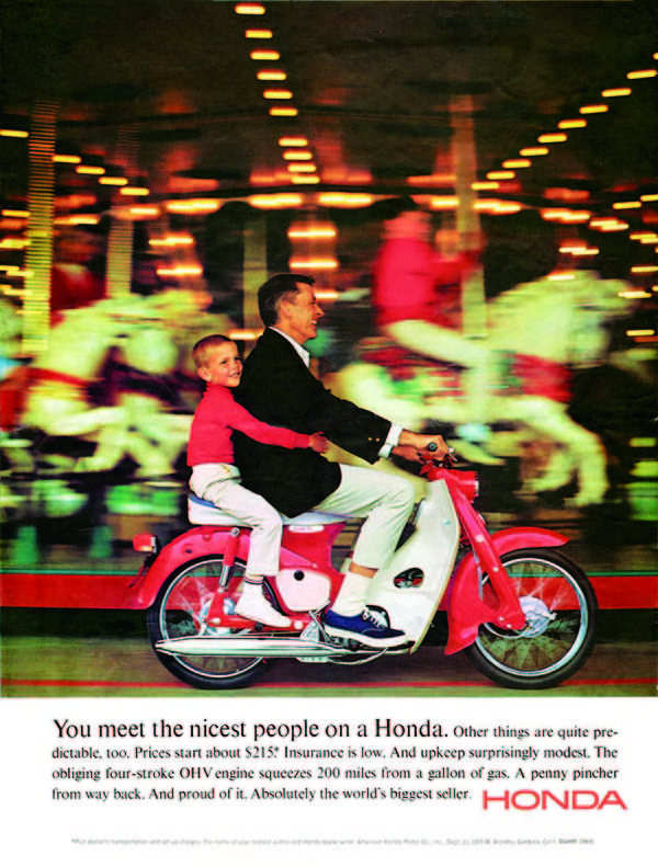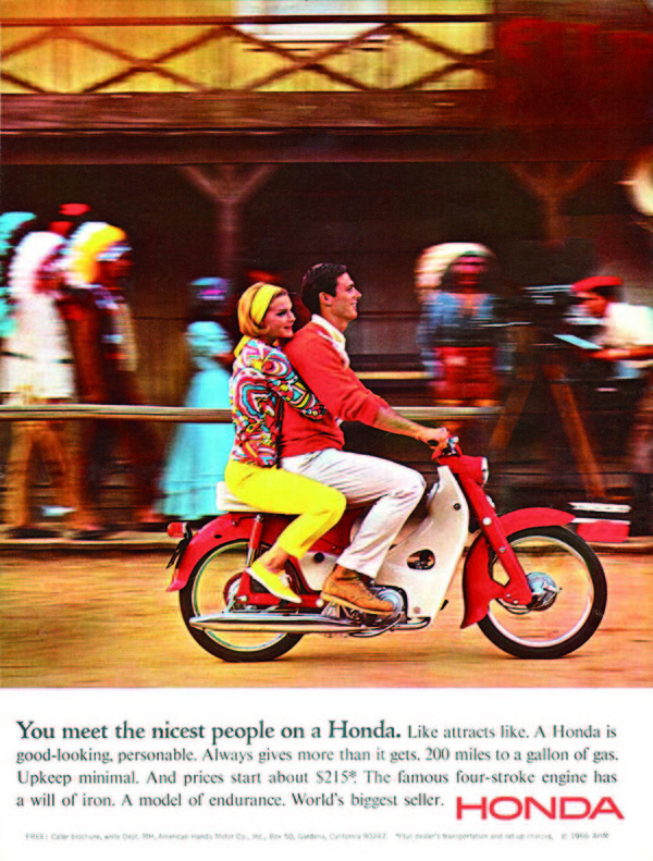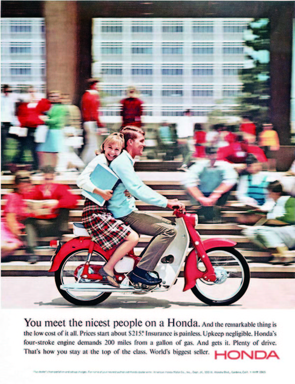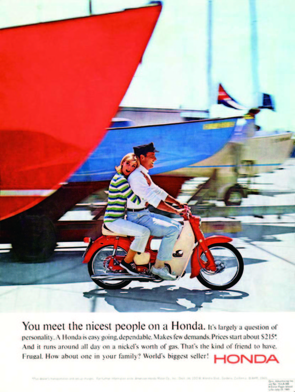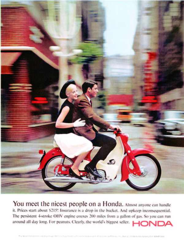 当初から世界を見据えて開発されたカブ。日本で発表された後にアメリカにも輸出されますが、これがあまり売れませんでした。それは、バイク=暴走族というイメージがあったからです。それを挽回したのが「NICEST PEOPLE ON A HONDA」の広告でした。