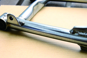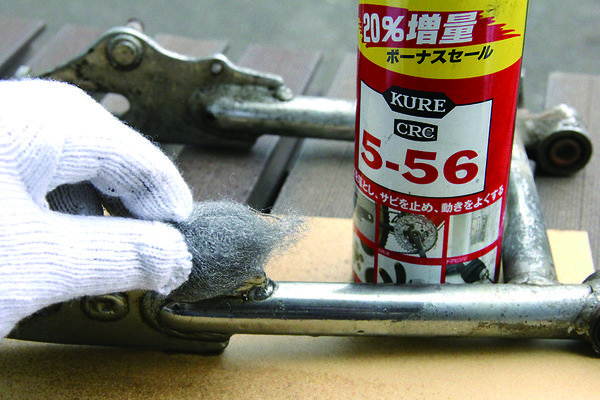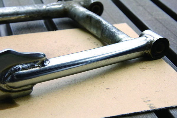 スイングアームは点錆があったのですが、メッキの剥がれも曲がりもなく綺麗だったので磨いて再利用します。プライベーターの昔ながらの技というか、KURE5-56とボンスターでひたすらゴシゴシ。再メッキとはいいませんが、アップで見なければOKな状態にはなりました(笑)