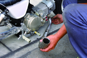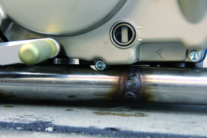 超クリアランスでダウンマフラーを製作。クラッチ下、ケースのネジ部分を避けるようにカット。ちょっと熱は心配ですが、スタイルは完璧!!