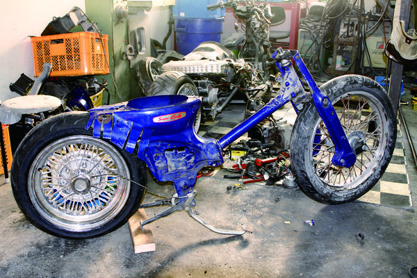 こちらは現在製作中のカブだが、今月末に熊本で開催されるF.T.W.FINAL に出品を予定。フロントにはDS400、リアはプロアームに四輪ホイール を合わせ、それもFIがベースととんでもない事になりそうな…。完成した 暁には本誌で紹介予定。こちらもお楽しみに〜!!