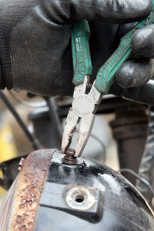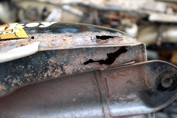 キャップを外して覗いただけでは分からなかったのですが、タンク左側は錆びて割れたのか大穴がポッカリと開いてました。サイドスタンドで車体が左側に傾いたまま何年も放置されたので、どうしても左側に水が溜まり、錆びたのでしょう