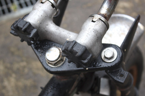 前回の記事である程度の外装と エンジンを下すところまで作業し たのですが、実は足周りがバラす ことができなかったという新真 実 !? 固着したクルクルハンドル と、固着したスイングアームピ ボットシャフトは家の工具だけで はどうしても外せませんでした。 これが外せないとフレームだけに 出来ないので、毎度お馴染み太洋 モータースさんに駆け込みました。 クルクル部は普通あまり動かさな い部分でもあるし、長年放置して いた車両ではネジが喰ってしまっ ていて回らない場合が多いのです。 ピボット部分は完全にグリス切れ