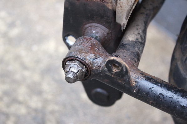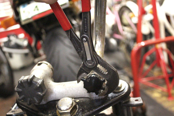 スイングアームのピ ボットシャフトが回 らず、エアーインパ クトレンチでないと ナメてしまう…、と 作業を中断