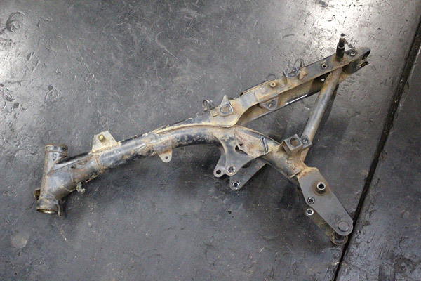 フレームだけになりました。これでフレームのサビ 落としに取り掛かれますね。エンジンに関してはま だ手付かずなので後回しに・・・・