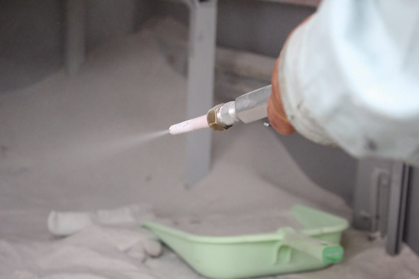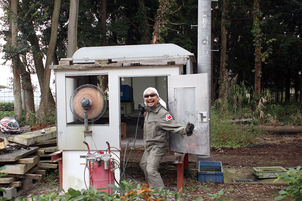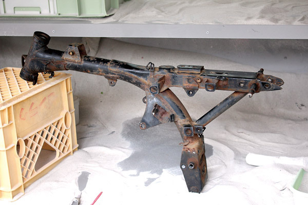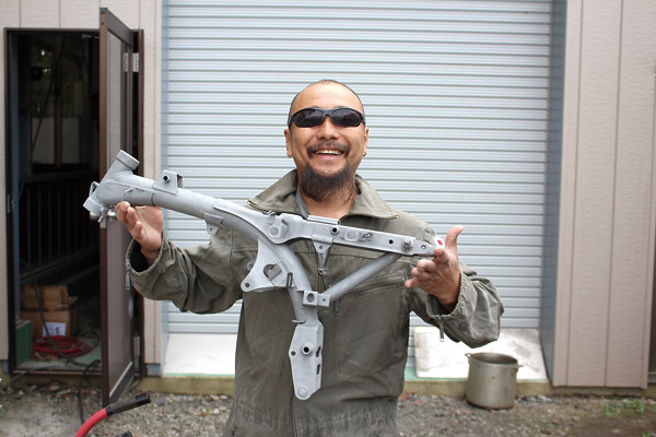 内海さんのご厚意でサンドブラスト作業は自分の手で やらせていただきました。小屋の中で作業するので大 きなフレームでも楽勝で作業可能なのです!