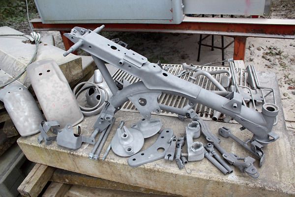 モンキーは鉄製のパーツが多いので、 車両一台分をブラストするとなると かなりの点数になります。これら全 部、素人で5時間かかりました