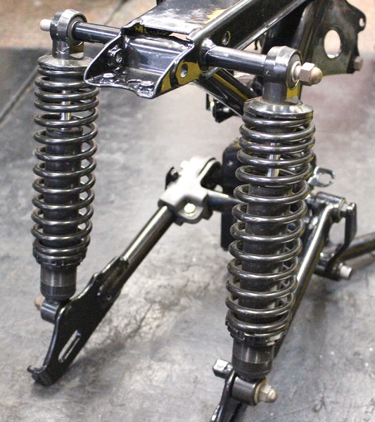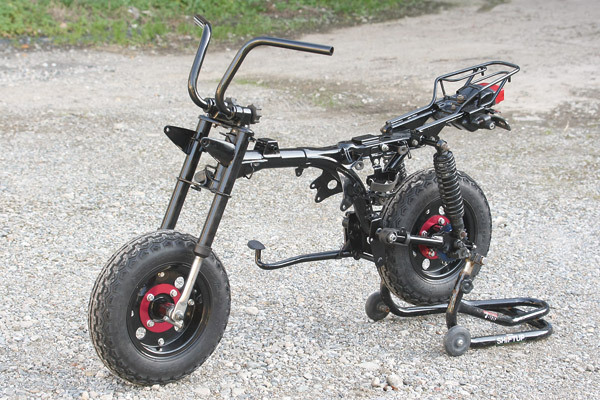 リアショックはシフトアップ製モンキーリアショックType-Ⅰ の280mm(¥3,800/税抜/1本)。パウダーコートの色に合わ せてブラック×ブラックです