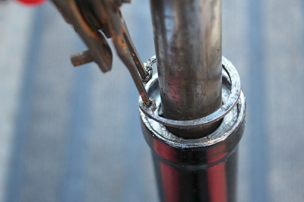 ネックのベアリング周りはこの順番で組んでいきます。レースは 上下で異なるので、品番をよく確認すること! フォークをフレ ームに組む前には先にハンドルロックも付けておくベシ