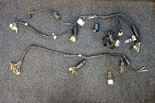 プラグコードなど一部6Vの方に繋げてない部品もありますが、12Vと6Vのハーネスを比べてみました。12Vの方は排ガス規制後のAB27だったので、各部接続がカプラーになっています。AB27ハーネスを加工しないで使うとなるとメインキーもスイッチもテールランプもAB27にしなければならない。う~ん…、これはこれで逆に使いずらいという結果になりました