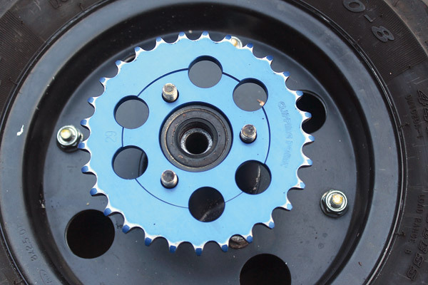 クリッピングポイント製スプロケットに変更していますが、モンキーのドリブンスプロケットは6Vと12Vそれぞれに適合する面が設定されていました。写真のように凹状にザグリが入っている面を外に向けるのが12V時で、凹側をホイール側に向けて使うのが6V時。間違えるとチェーンラインがズレます。