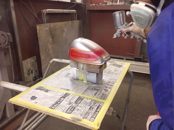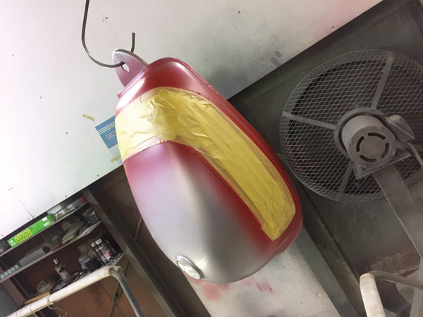 ⑧赤を入れていきます。ベースに多少赤が乗っていますが、上から黒を吹くので問題なし。銀を吹いたのは赤のノリを良くするためでもあります。白や銀を下に吹いておくと色のノリが良くなるのです.