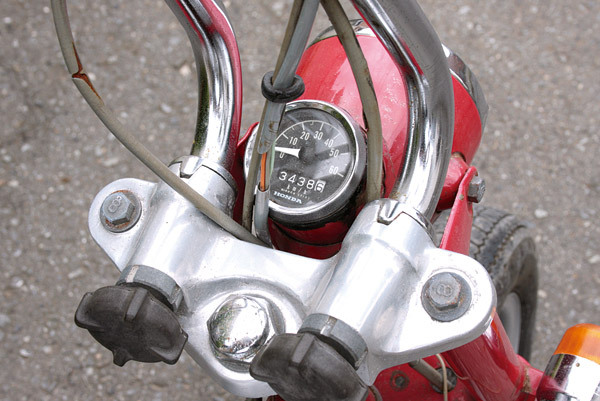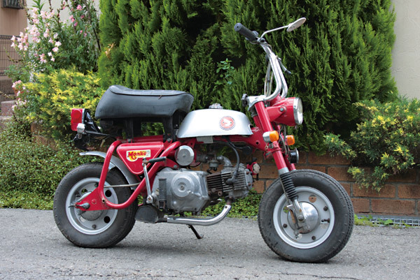 1969年に発売されたZ50A。それまで作られていた前後リジッド&5インチタイヤのM型から8インチになって生まれ変わった最初のニューモンキー。1970年になるとフロント周りが外れるZ50Zになり、そちらはアップマフラー&フットブレーキです。