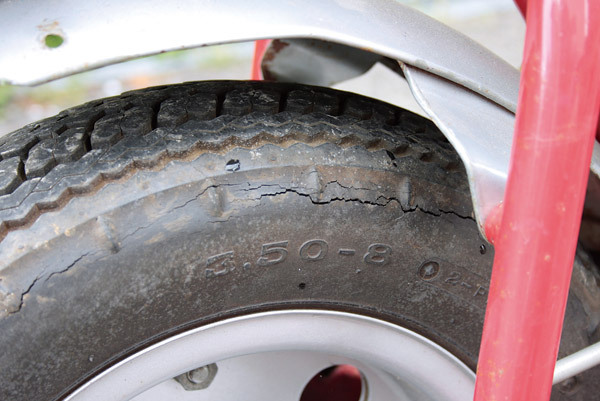 前後タイヤは辛うじて空気は入っているものの、サイドにヒビも入っているしほぼパンク状態。作業効率UPのために、まずはタイヤを変えておきます。