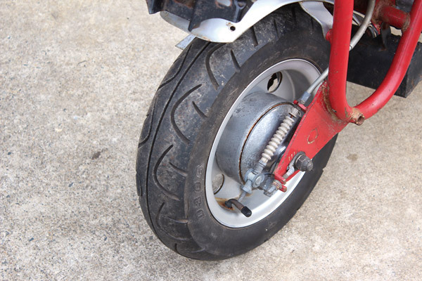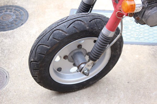 ダンロップのD306の中でも唯一の8インチサイズ(3.00-8 26J)を前後に装着。これで押し歩き時に軽く転がせるようになりました。