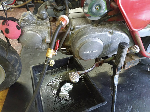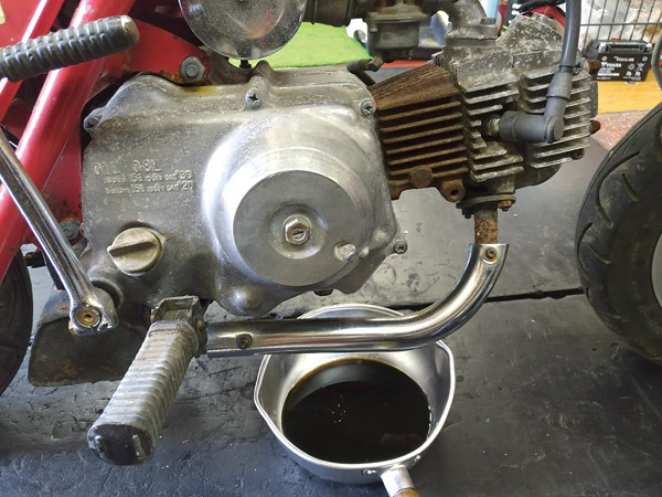 キックを踏んだら圧縮はあったので「このままかかっちゃうかも?」という淡い期待を抱いて、まずはオイル交換しておくことに。廃油からは謎のツブツブも排出…