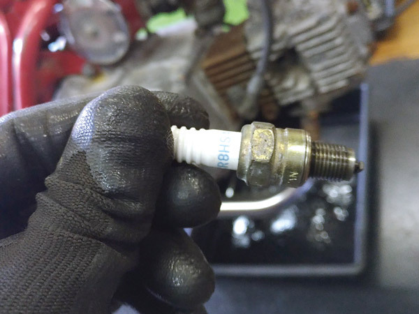 プラグに火は飛んでいたのですが、キックしてもかからない。CR 8H SA が入っていたのですが、これは新品のCR6HSAに変えてみます。