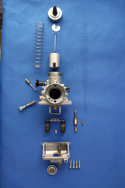 (上から)トップキャップ、ジェットニードルセット、スロットルバルブスプリング、スロットルバルブ、エアスクリュー、アイドリングスクリュー、フロートピン、フロート、フロートバルブ、ジェットニードルホルダー、スロージェット、メインジェット、フロートチャンバー、ドレンボルト
