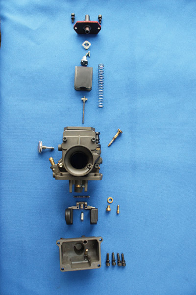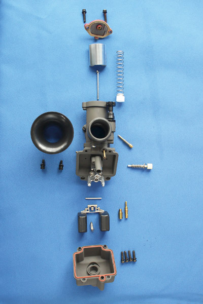(上から)トップキャップ、スロットルバルブ、スロットルバルブスプリング、MJN、エアスクリュー、アイドリングスクリュー、フロートピン、フロート、フロートバルブ、メインジェット、スロージェット、フロートチャンバー