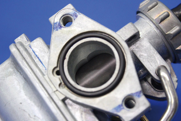 PCφ20のスロットルバルブが上下する部分は素直なオーバル型ではなく2分割の雪だるまのような形になっています。これはスロットルワークによる中間部分でのボコ付きや谷を少なくしたり、レスポンスのことを考えられた構造