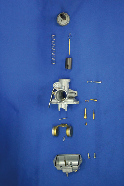 (上から)トップキャップ、ジェットニードルセット、スロットルバルブ、スロットルバルブスプリン、アイドリングスクリュー、エアスクリュー、ジェットニードルホルダー、フロートピン、フロート、メインジェット、フロートバルブ、フロートチャンバー
