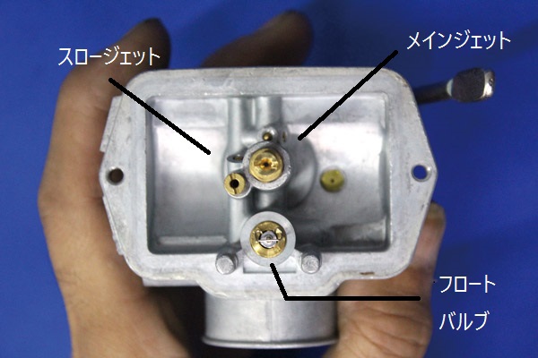 フロートを外した状態がこちら。通常はフロートと一緒にフロートバルブも抜けますが、分かりやすくするためにフロートバルブはボディに差し込んであります。