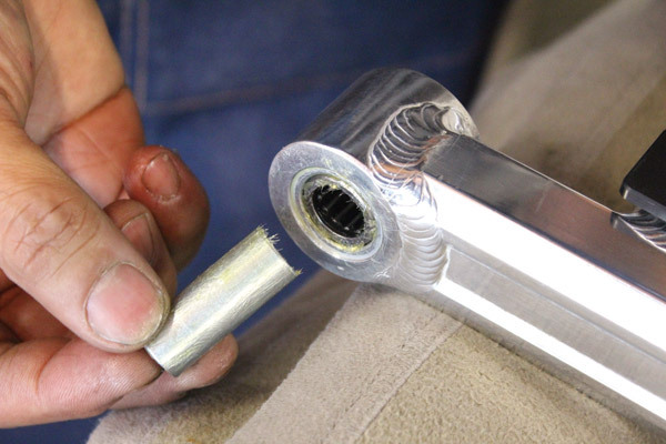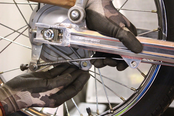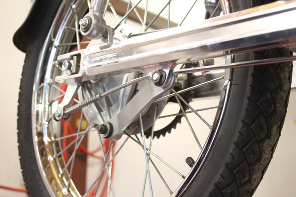 パンク修理などの時にリアホイールを外してもチェーンやスプロケットが車体に残るのはカブの特徴の1つ。その構造を担っているリアホイールアクスルスリーブによって、純正のスイングアームの穴は左側のみ大きくなっています。アルミスイングアームはリアホイールアクスルスリーブが入る大きさではないために加工が必要です!