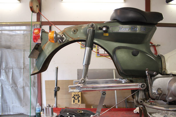 カモメカブのスイングアームはリアショック下側のマウントがかさ上げされているので短くても事足りるのですが…。今回はとりあえずC50のリアショックに変更することで正規の位置に取り付け出来ました。