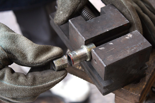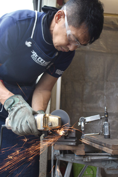 リアホイールアクスルスリーブをカットします。サンダーで大まかに切り取った後に、旋盤で引いて面を出しておきます。