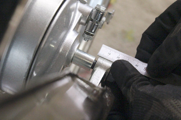 まずはモンキー用のデイトナ製ホイールスペーサーの1.6 mmを使って右側にオフセット。更に左右にシムとカラーを追加してセンターを出しました。
