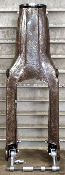 極太なホイールに合わせてワイドに作られたKEPSPEED製フォーク。ノーマルの見た目はそのままワイドに出来るのは嬉しい限り! 色は錆色コーティングを施したアンティークブラウンとホワイトの2種類を用意