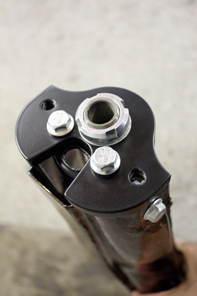 シャフト取り付け部の内幅は約153mm。ハンドルポストのピッチは約80mm。バーハンにするならばこの穴にポストを立てればOK!