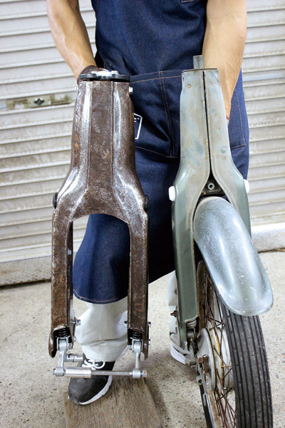 取り外したノーマルフォークとワイドフォーク。ワイドフォークの幅は純正よりも40mmほどワイドになります。