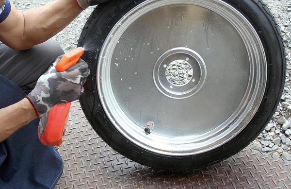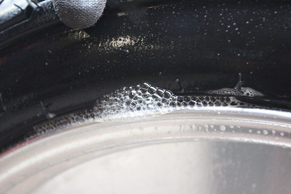 タイヤをハメたら石鹸水をリムやバルブ周りに霧吹きなどで吹き付けることで、エア漏れしてないか(エア漏れがある場合泡立ちする)見ておきたい。リムからエア漏れしている場合はビードシーラーなどを使うと抑えることができるでしょう。