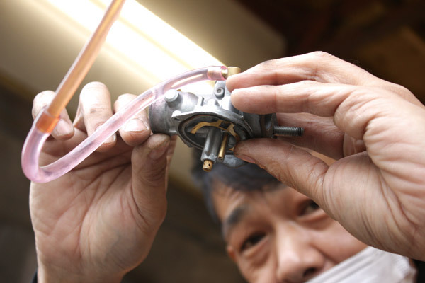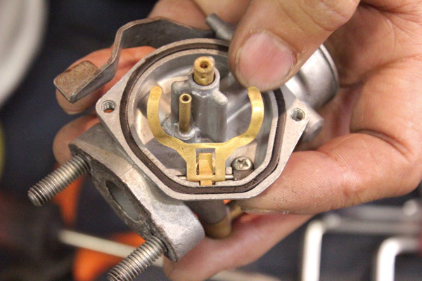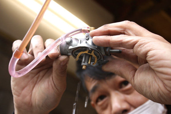 ガソリンがキチンと止まるかをチェック しているところ。フロートが上がることでフロートバルブが正常に作用し、ガソリンが行かないことを確認するのです!