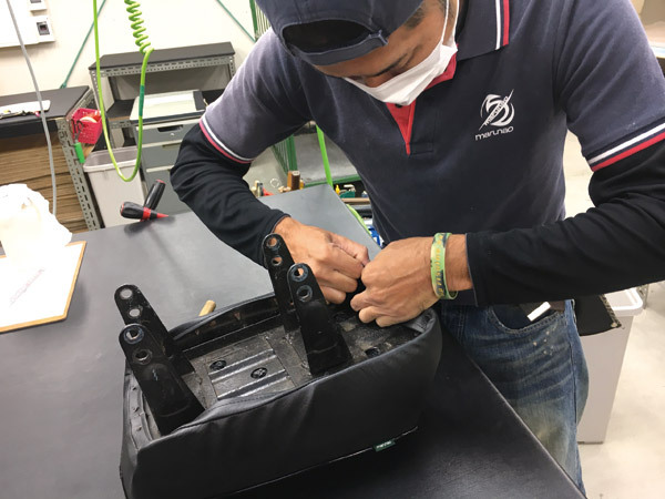 表皮になる部分を裁断。実はシートベースが歪んでいて左 右が均等ではなかったそうで、そんな部分でも今回お手間 をかけたようです