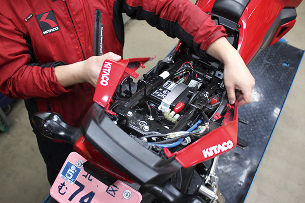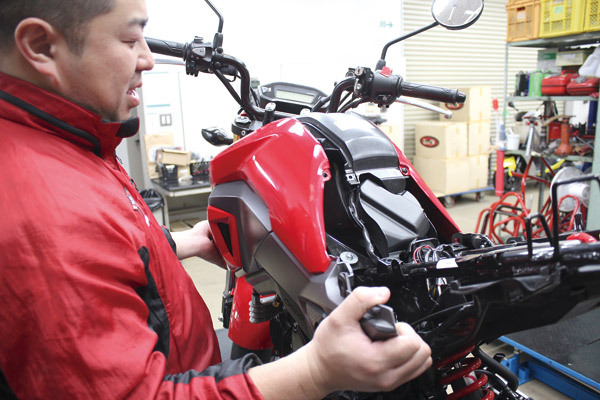 この連載でも何度目か分かりませんが、まずは外装を外していきます。GROMの場合は何をするにも外装を外してから! 言い方を変えれば見せたくない配線類をうまくカバーしているとも言えますね。