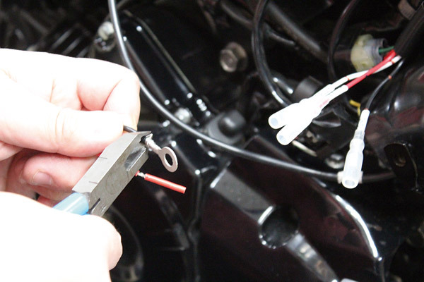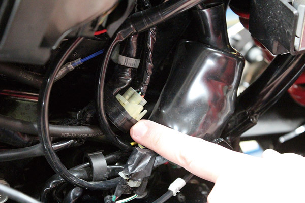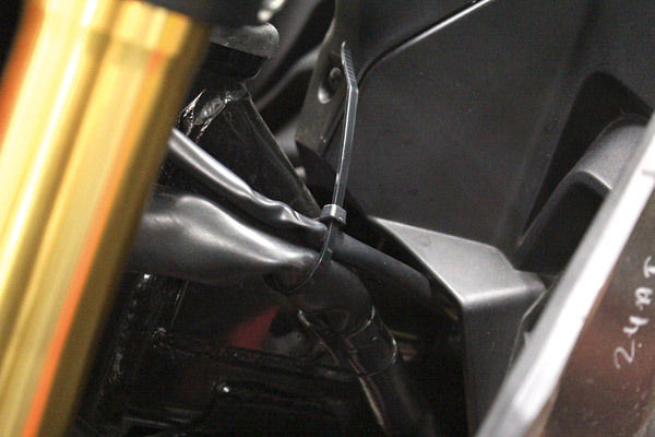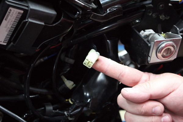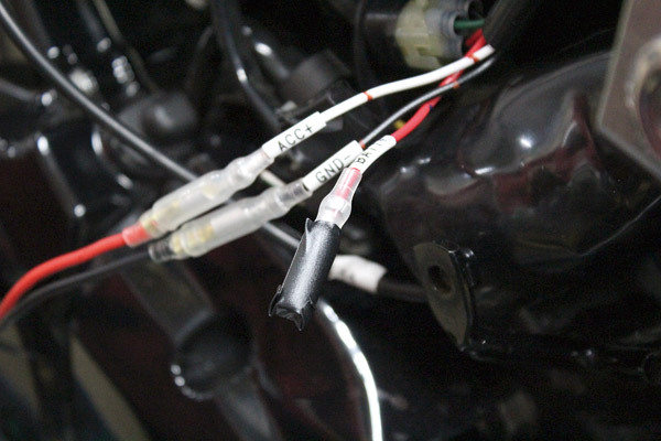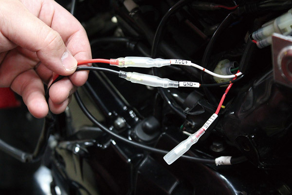 昨今のバイクシーン、ユーザーの中では定番化しているUSB電源キット。φ22.2ハンドル用の取り付けステーも付属。電源取り出しハーネスは純正ハーネスに用意されるカプラーに装着することで、今回のようなアクセサリーパーツの電源が簡単に取り出すことが可能に。