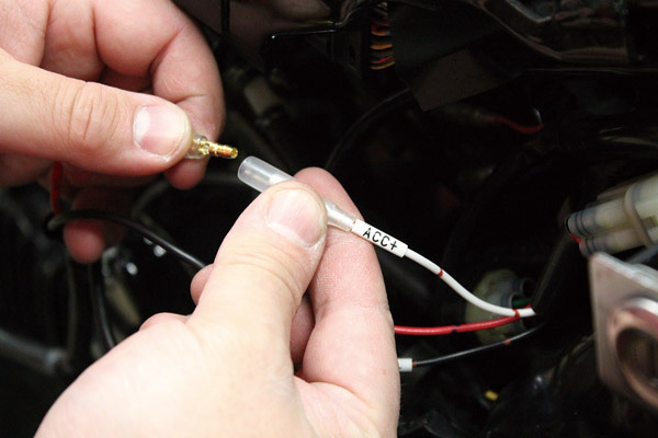 コチラが純正ハーネスに用意されるカプラー。これに電源取り出しハーネスを取り付けていきます。専用設計なので差し込むだけ。取り出しのリード線には分かりやすいように電源ラベルもついているという、なんともユーザーに優しい設計。
