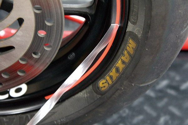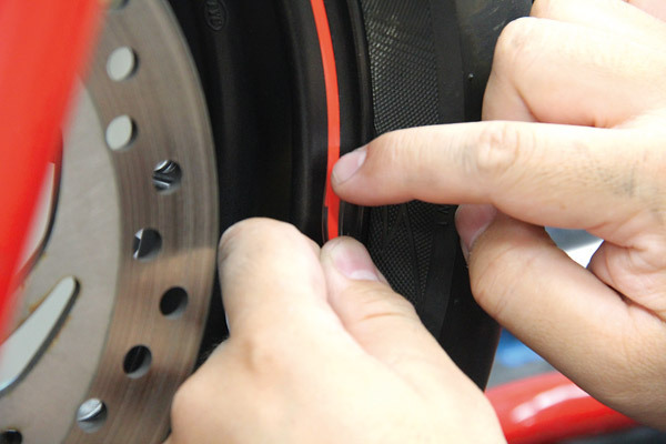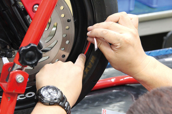 今回は丸っと貼り付けるので1輪両側で約9本使用しました。ラインの間にKITACOのロゴや、文字を入れたりすれば片側4本で足りますね。
