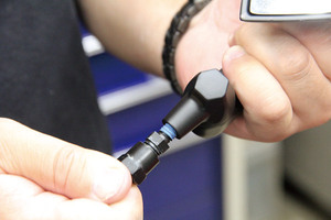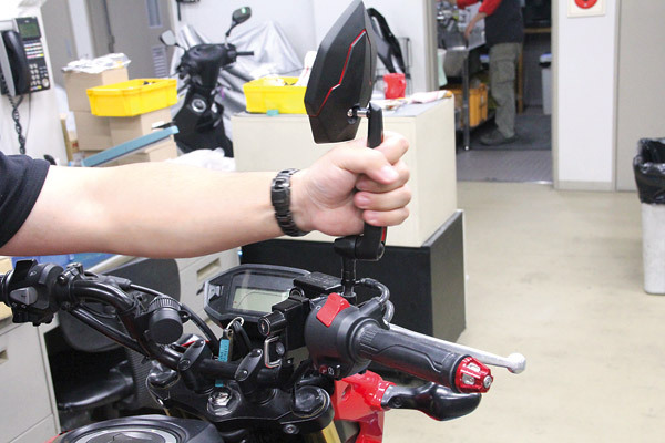 まずは純正を外します。付属のミラーアダプターにはネジロックが塗布されており、そちらをミラー側にして装着します。アルミダイカスト製なので純正とは比べ物にならない重厚な仕上がり。