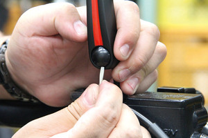 まずは貼り付ける面をパーツクリーナーで汚れを落とし、シリコンオフで脱脂。もちろん手もキレイにしておきましょう。