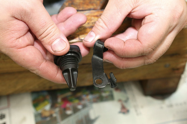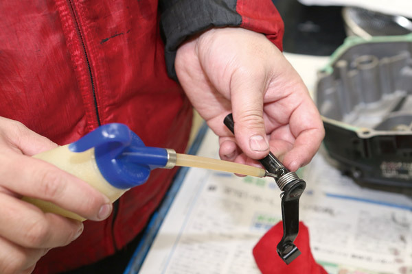 純正のクラッチカバーに残っていたクラッチリフターロッドを外し、オイルをタップリと塗布し(シールに傷をつけないように)、クラッチカバーKITに移植します。