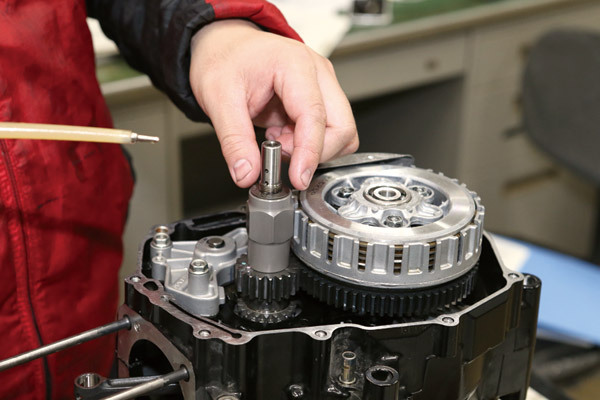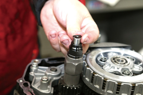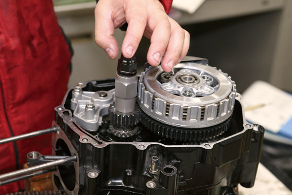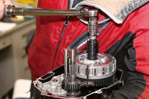 用工具を使いクラッチセンターロックナットを本締めします。作業するには専用工具が必須。事前に用意するのを忘れずに!! 規定トルクは64N・m