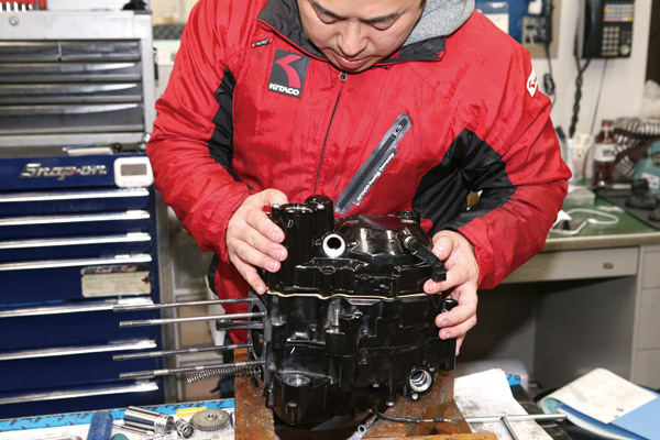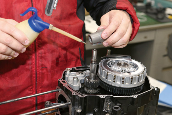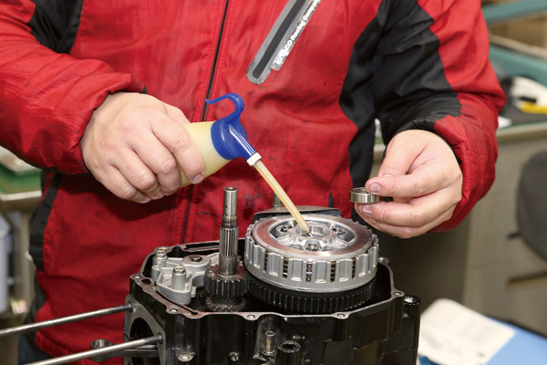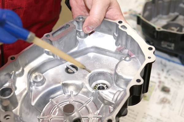 キタコ製クラッチカバーKITの内側に用意されるベアリングには少し多めにオイルを塗布し、これまで作業してきた腰下に取り付けます。もう少しで完成ですね。