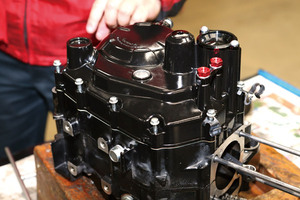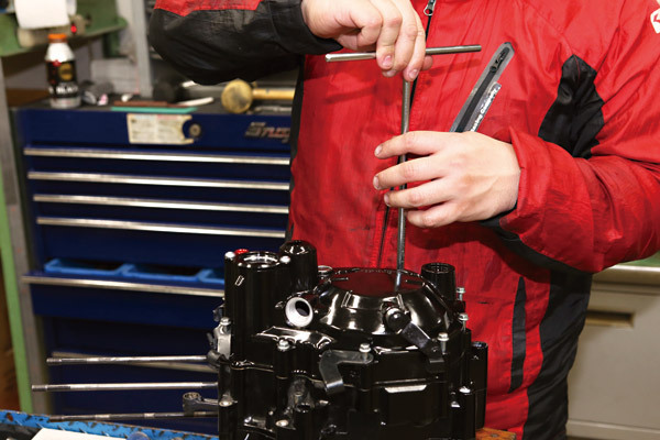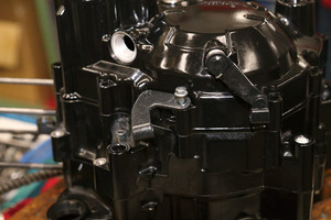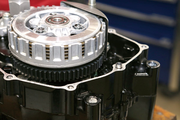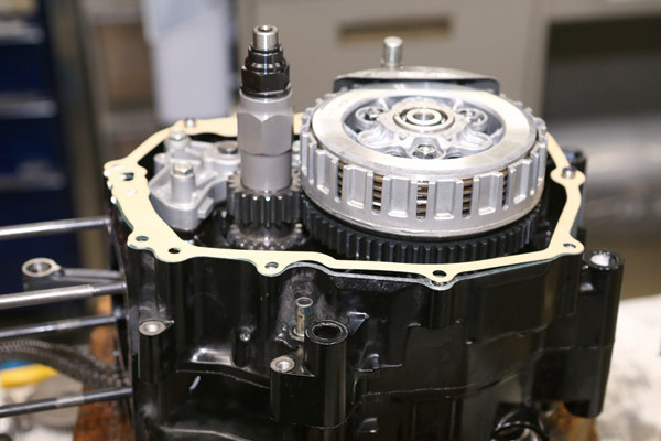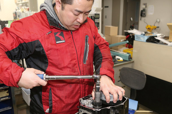 純正で使用していたクラッチケーブルレシーバー、油温センサーワイヤークランプなどを所定の位置に配置し、ボルトを対角線上で締め込んでいきます。規定トルクは10N・mこれにて腰下は終了!!