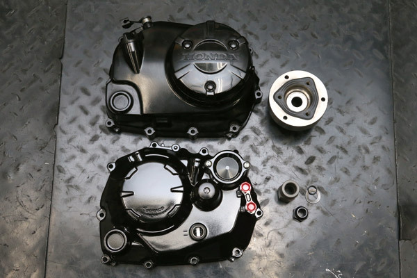 クラッチアウターの中心、ワッシャーが入る部分とワッシャーにもオイルを塗布しエンジンに組み付けていきます。下側のオイルセパ