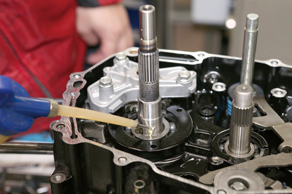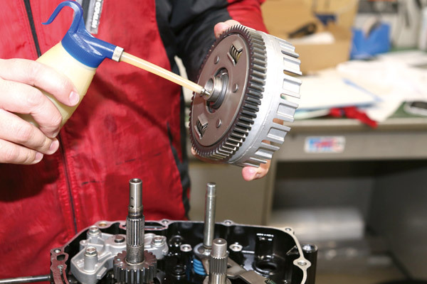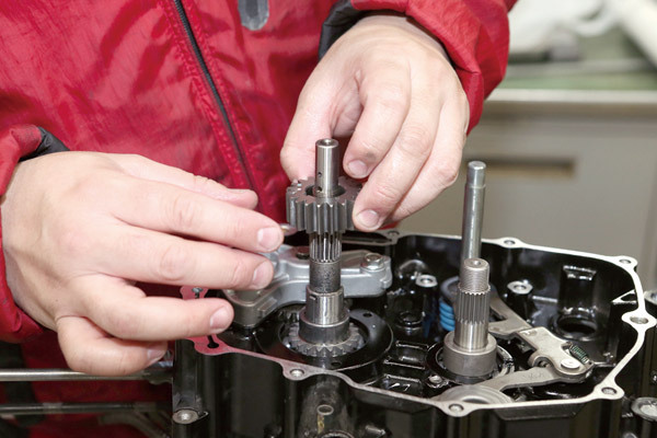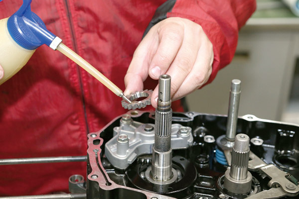 クランクシャフトにオイルを塗布しオイルポンプドライブギヤ、次にプライマリードライブギヤを取り付けます。各ギヤにはオイルはタップリ塗布しておきましょう。