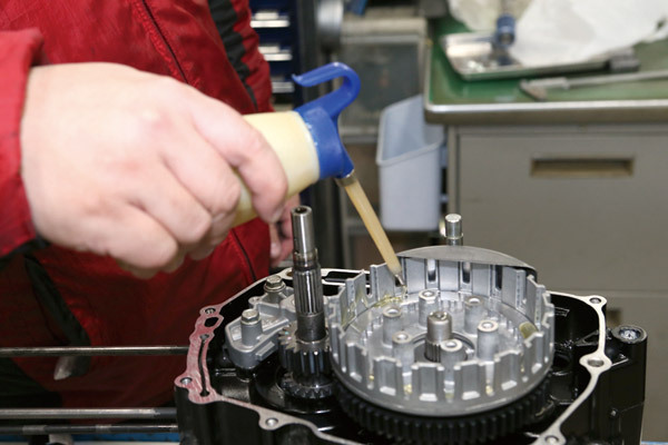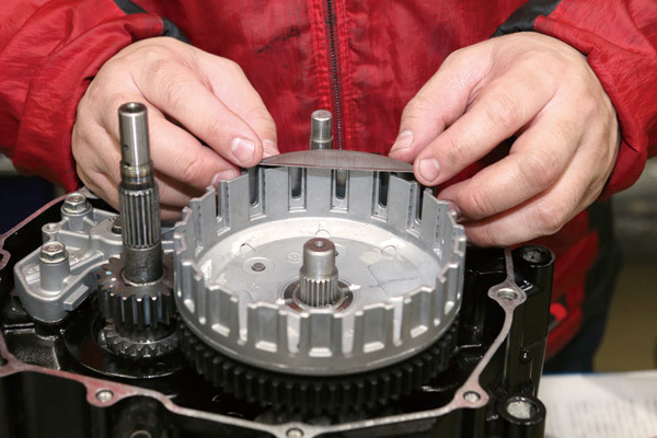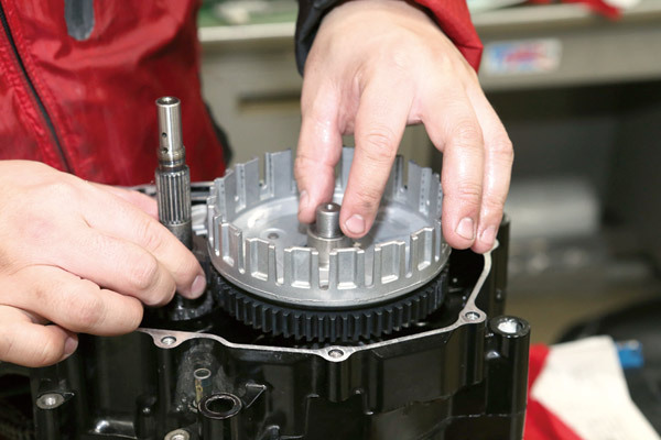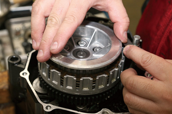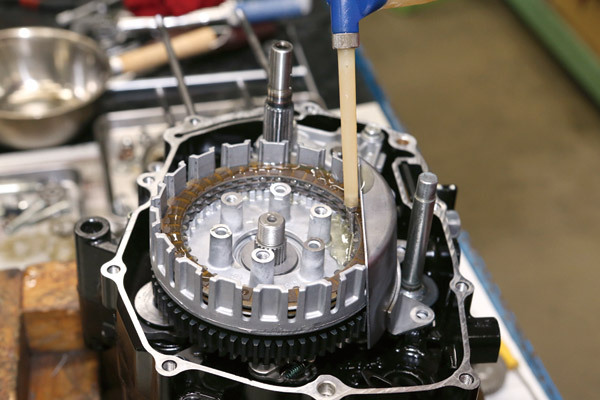 クラッチアウターにオイルを塗布し、プレッシャープレート、オイル、クラッチプレートは1枚づつオイルを塗布しながら組み付け、クラッチセンターで蓋をします。